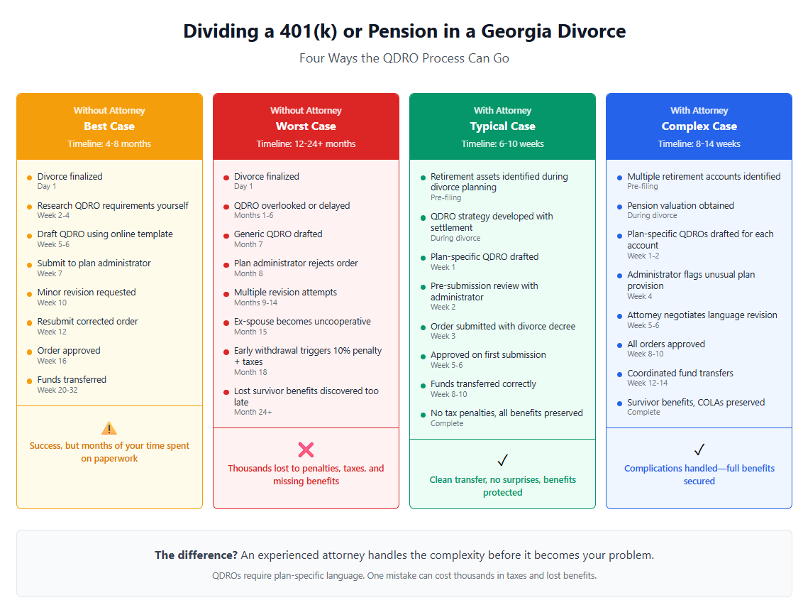 Dividing a 401K or pension is rarely a single-step process, and where things break down is usually between the divorce order and the retirement plan itself. Understanding how that process flows, and where problems commonly arise, helps explain why attorney involvement matters.